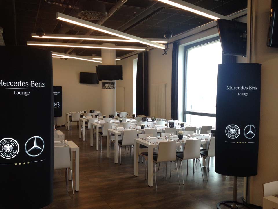 Ob Ecksegel, Mundlöcher, Spielertunnel oder die Lounge Bereiche von Mercedes-Benz, das Branding fand für die Fans in allen Bereichen seine einheitlich hochwertige Darstellung.