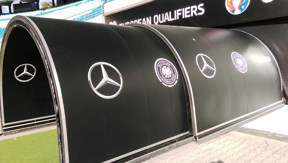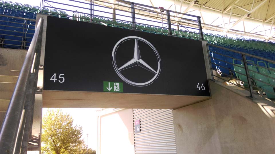 Auch bei diesem Spiel setze VETO im Auftrag der Daimler AG das Stadionbranding im Design der Marke Mercedes-Benz um. Einige Bilder der Brandings von Mercedes-Benz im Stadioninnenraum, Stadionumlauf sowie Lounge-Bereich sehen Sie in der beigefügten Galerie.