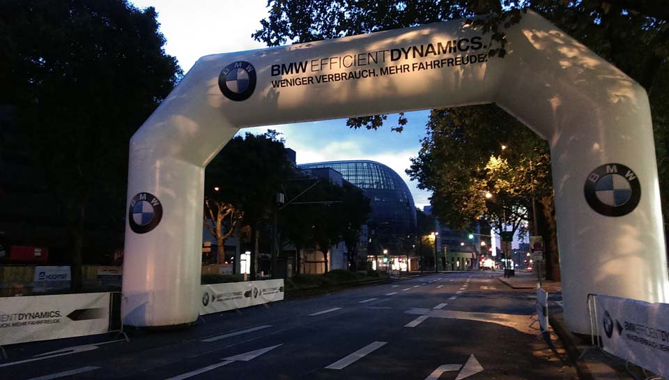 Am frühen Sonntagmorgen wurden die nötigen Werbemittel wie Endlosbande, Torbögen, Banner, Beachflags, etc. in kürzester Zeit aufgebaut und auf der rund 42 Kilometer langen Laufstrecke verteilt.