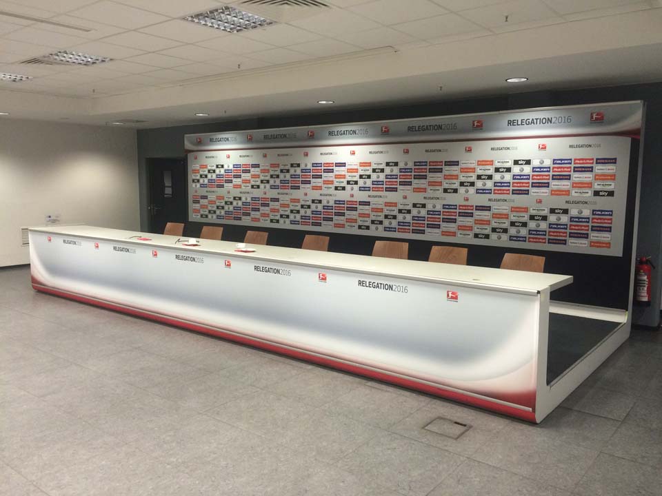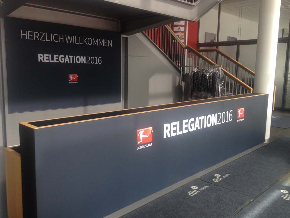 Bei allen vier Relegationsspielen in Frankfurt, Würzburg, Nürnberg und Duisburg war VETO gleich mehrfach im Einsatz. Im Auftrag der DFL Digital Sports stattete VETO die Stadien im einheitlichen Event Design aus und brandete diverse Sonderflächen. Vermarktungspartner Lagardère Sports Germany GmbH beauftragte VETO mit der Umsetzung aller statischen Werbemittel & Partnerdarstellungen. Innerhalb kürzester Zeit brandete VETO in den vier Stadien die vermarkteten Werbeflächen und ermöglichte den Partnern somit eine optimale Präsenz im TV-Bild.